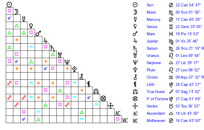 | Moon | 27 Libra 46 | 17 Pisces 21 | 24 Aries 22 |