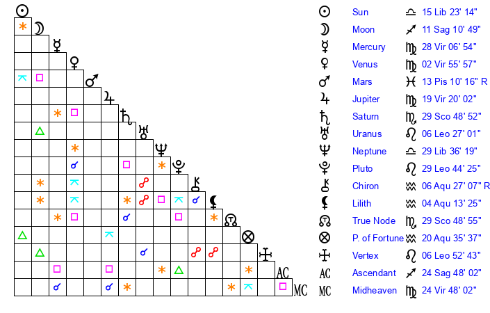 | Saturn | 0 Sagittarius 12 | 27 Pisces 6 | 7 Sagittarius 57 |
