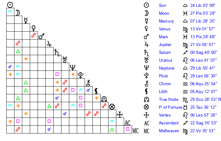 | Moon | 24 Pisces 44 | 6 Virgo 26 | 14 Libra 3 |