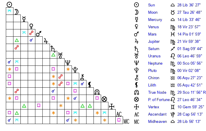 | Neptune | 0 Scorpio 6 | 29 Pisces 59 | 2 Scorpio 16 |