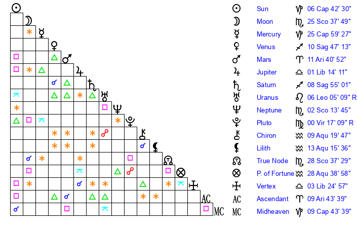 | Mercury | 25 Capricorn 51 | 23 Sagittarius 0 | 4 Pisces 46 |