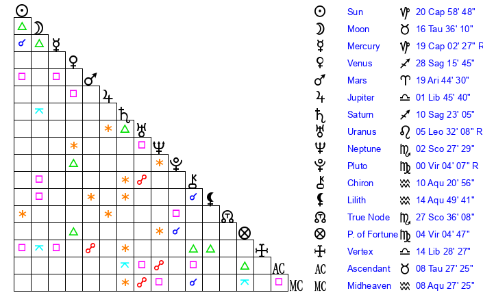 | Moon | 14 Taurus 10 | 27 Libra 45 | 7 Sagittarius 53 |
