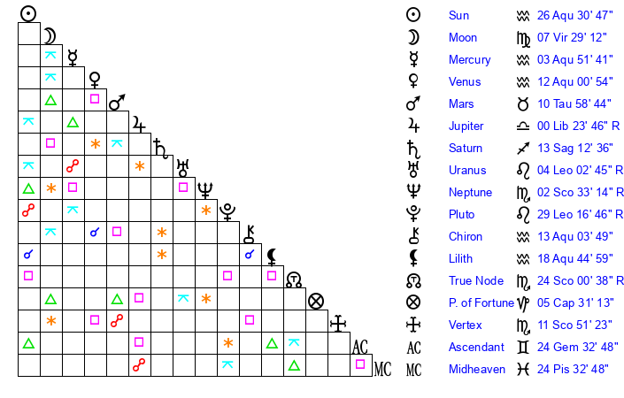 | Moon | 4 Virgo 37 | 27 Virgo 15 | 28 Aquarius 56 |