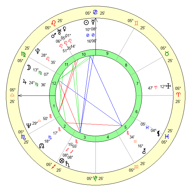 | Moon | 10 Virgo 25 | 4 Libra 45 | 5 Pisces 10 |