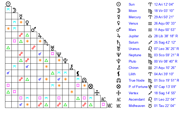 | Sun | 12 Aries 1 | 12 Aries 46 | 16 Gemini 58 |