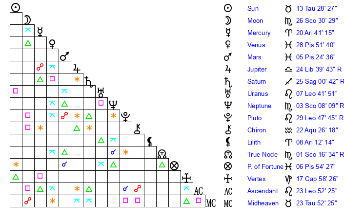 | Moon | 23 Scorpio 48 | 10 Leo 31 | 1 Taurus 5 |