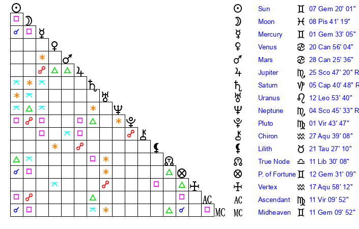 | Moon | 6 Pisces 23 | 7 Cancer 53 | 24 Cancer 25 |