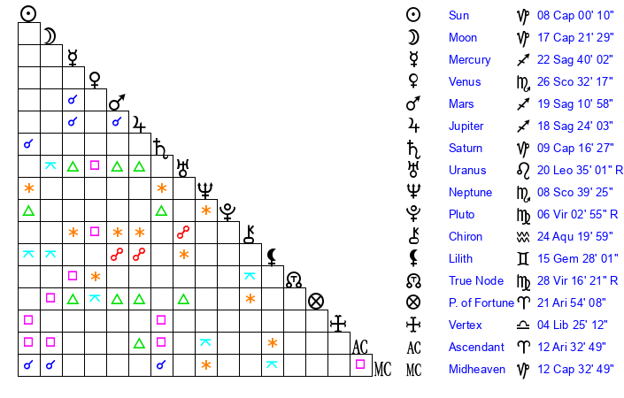 | Moon | 14 Capricorn 31 | 11 Taurus 20 | 12 Gemini 34 |