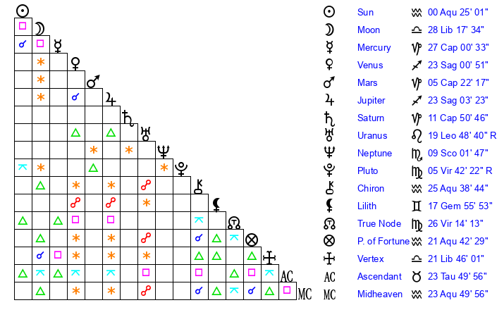 | Sun | 0 Aquarius 13 | 1 Aquarius 28 | 5 Aries 36 |