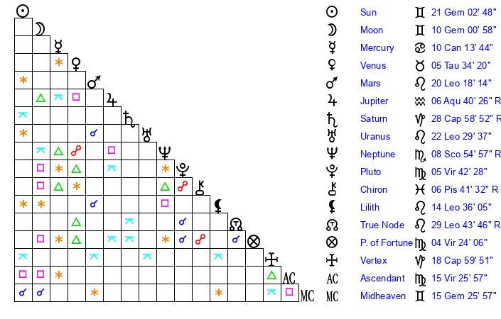 | Moon | 9 Gemini 51 | 2 Capricorn 28 | 3 Libra 56 |