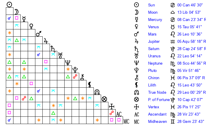 | Neptune | 8 Scorpio 44 | 2 Aries 7 | 8 Scorpio 51 |