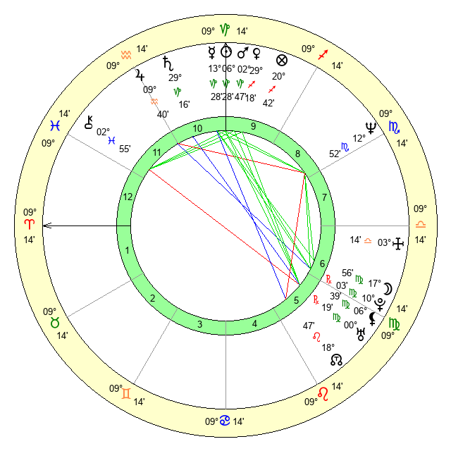 | Moon | 15 Virgo 40 | 12 Aries 52 | 13 Capricorn 47 |