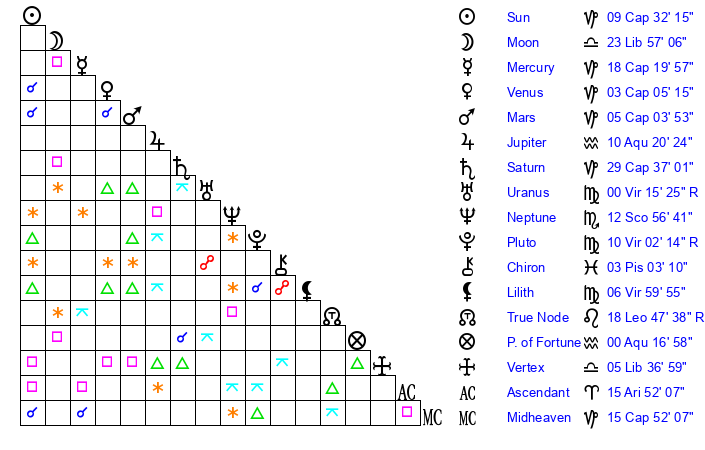| Saturn | 29 Capricorn 52 | 26 Pisces 2 | 7 Aquarius 13 |
