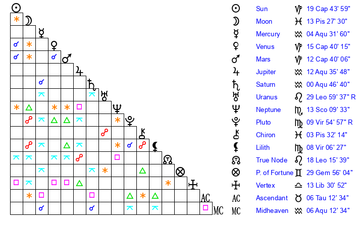 | Saturn | 1 Aquarius 1 | 15 Pisces 13 | 8 Aquarius 6 |