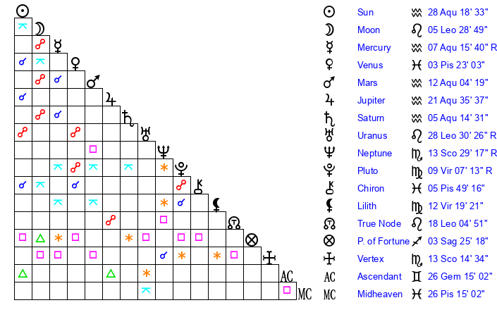| Saturn | 5 Aquarius 29 | 19 Pisces 12 | 10 Aquarius 54 |