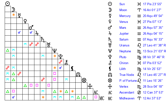| Mars | 26 Aquarius 49 | 17 Cancer 53 | 15 Aries 50 |