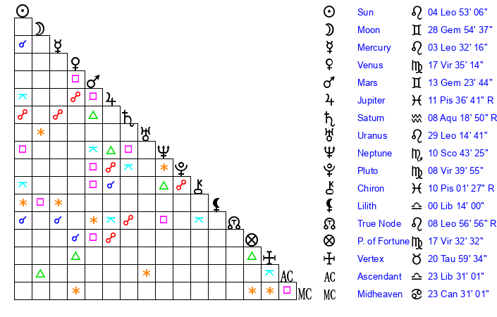 | Venus | 17 Virgo 23 | 26 Gemini 40 | 18 Scorpio 26 |