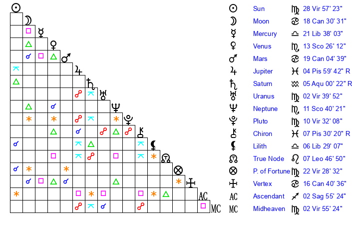 | Sun | 28 Virgo 46 | 29 Virgo 31 | 1 Sagittarius 30 |