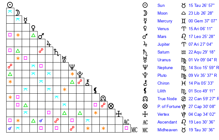 | Uranus | 1 Virgo 12 | 26 Taurus 38 | 2 Virgo 40 |