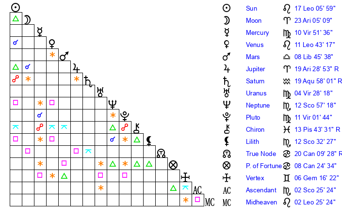 | Moon | 20 Aries 18 | 29 Aquarius 50 | 5 Leo 11 |