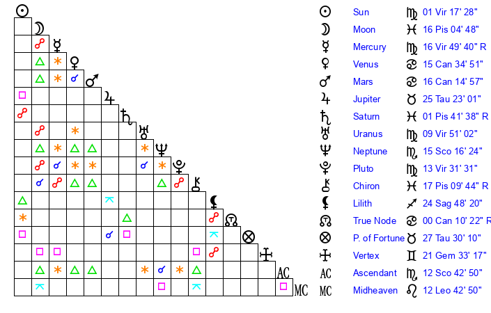| Moon | 13 Pisces 42 | 13 Virgo 21 | 12 Gemini 9 |