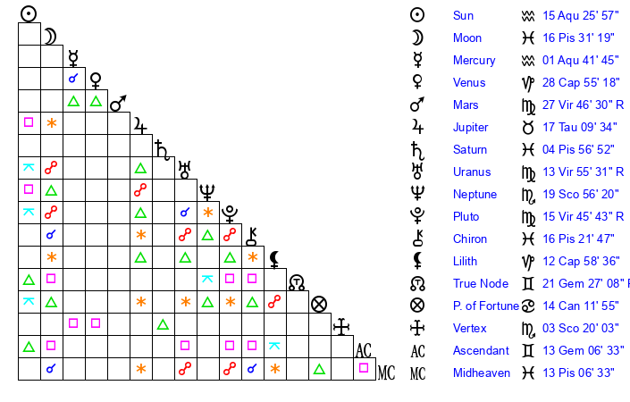 | Pluto | 15 Virgo 46 | 2 Aquarius 9 | 14 Virgo 16 |