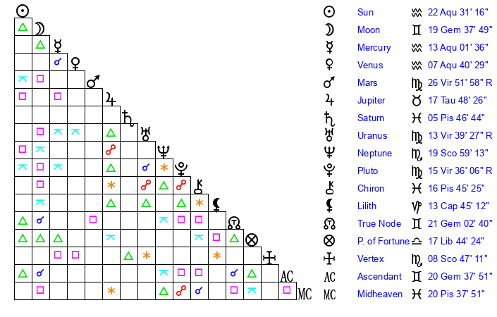 | Saturn | 5 Pisces 57 | 18 Pisces 30 | 12 Pisces 59 |