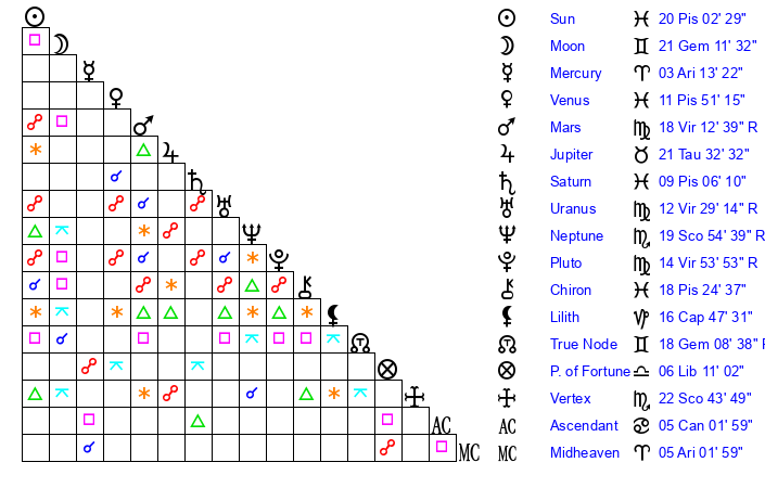 | Pluto | 14 Virgo 55 | 3 Aquarius 7 | 13 Virgo 45 |
