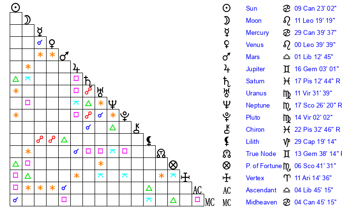 | Sun | 9 Cancer 13 | 9 Cancer 41 | 6 Virgo 40 |