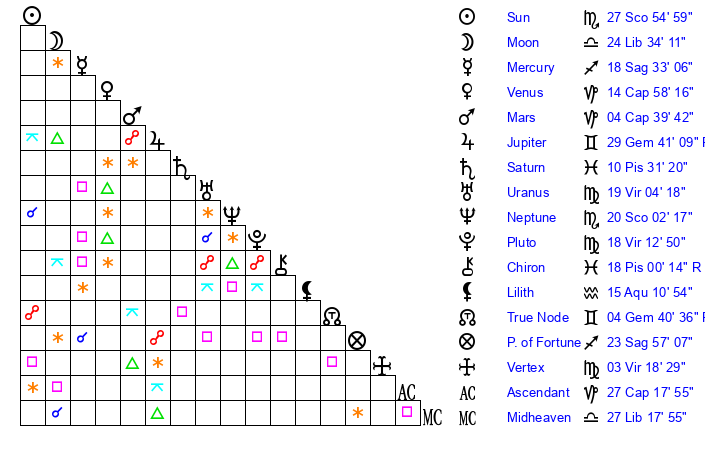 | Moon | 21 Libra 57 | 28 Scorpio 4 | 2 Capricorn 17 |