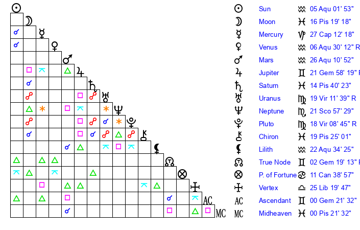 | Saturn | 14 Pisces 51 | 16 Pisces 39 | 21 Pisces 49 |