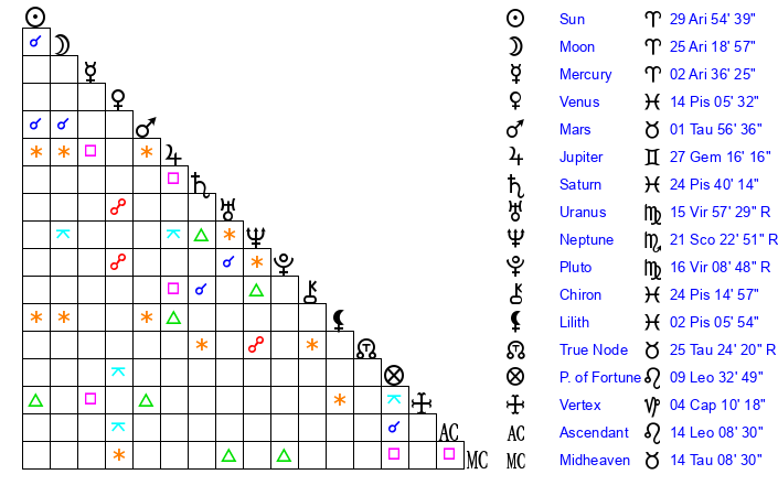 | Venus | 13 Pisces 54 | 25 Pisces 38 | 20 Taurus 21 |