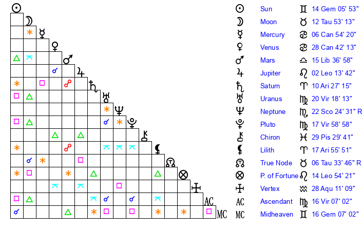 | Sun | 13 Gemini 55 | 14 Gemini 52 | 9 Leo 17 |
