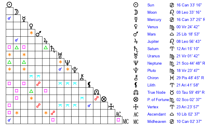 | Venus | 0 Virgo 16 | 5 Gemini 7 | 2 Virgo 3 |
