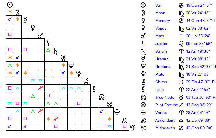 | Venus | 2 Virgo 30 | 8 Gemini 28 | 0 Virgo 32 |
