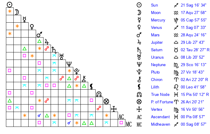| Sun | 21 Sagittarius 5 | 21 Sagittarius 30 | 18 Aquarius 4 |