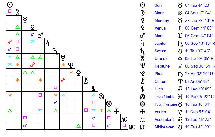 | Saturn | 11 Taurus 43 | 27 Pisces 29 | 18 Taurus 25 |