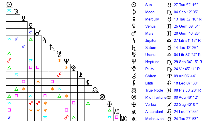 | Mercury | 13 Taurus 32 | 16 Taurus 1 | 27 Cancer 50 |