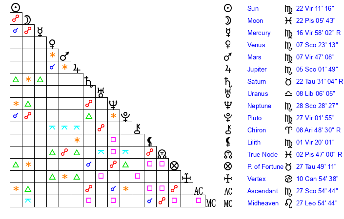 | Sun | 22 Virgo 0 | 22 Virgo 41 | 16 Scorpio 26 |