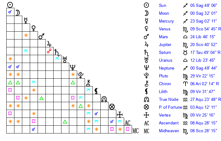 | Sun | 5 Sagittarius 36 | 6 Sagittarius 16 | 1 Aquarius 34 |