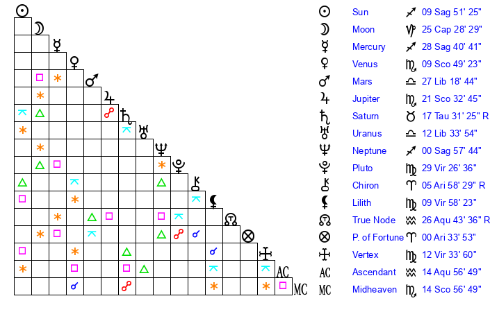 | Sun | 9 Sagittarius 40 | 10 Sagittarius 19 | 5 Aquarius 39 |