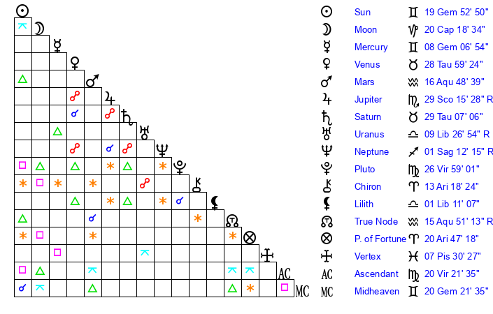 | Sun | 19 Gemini 42 | 20 Gemini 36 | 11 Leo 14 |