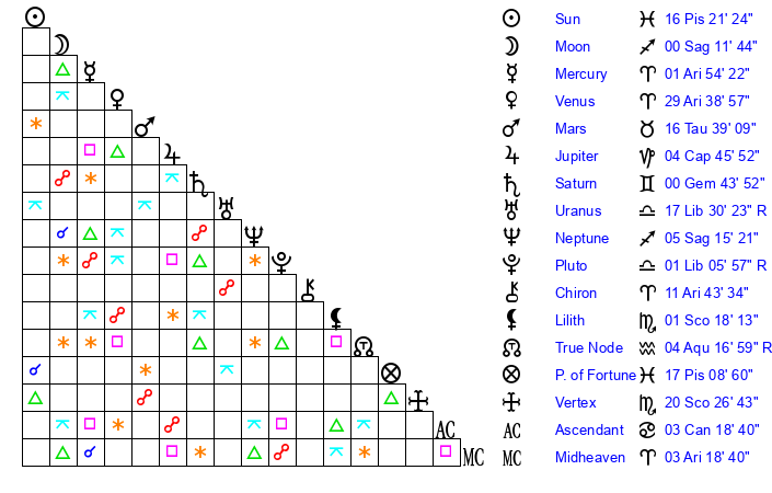 | Neptune | 5 Sagittarius 14 | 29 Pisces 5 | 4 Sagittarius 33 |