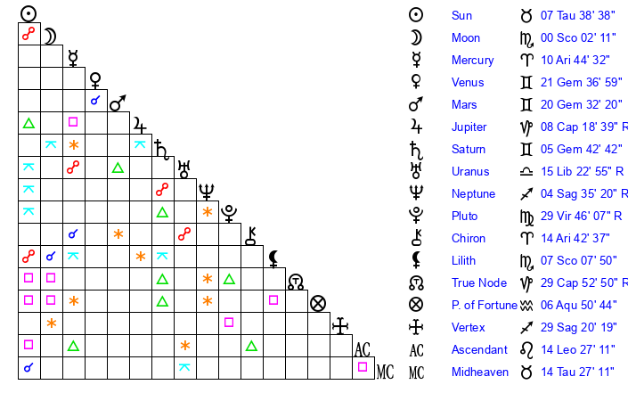 | Sun | 7 Taurus 5 | 7 Taurus 15 | 28 Gemini 4 |