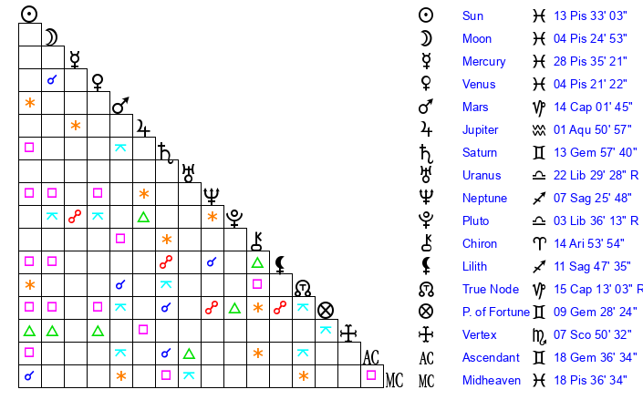 | Saturn | 14 Gemini 16 | 21 Pisces 1 | 18 Gemini 8 |