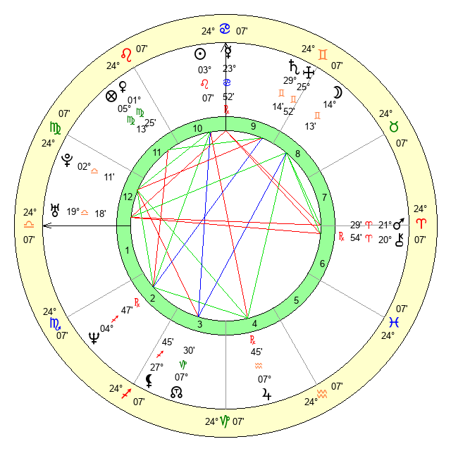 | Venus | 1 Virgo 25 | 24 Gemini 22 | 3 Scorpio 23 |