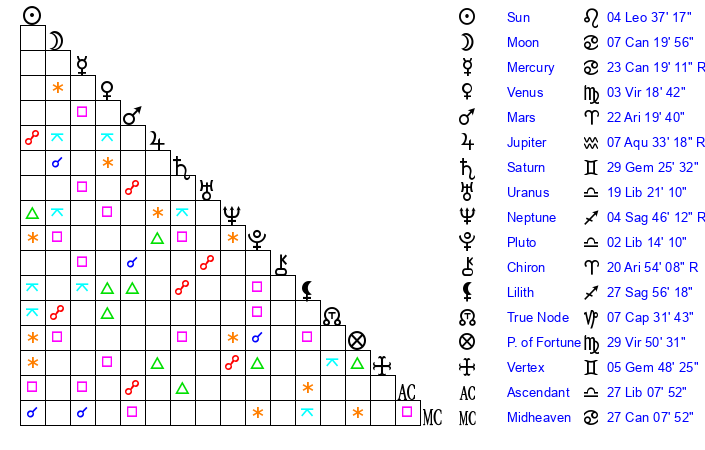 | Uranus | 19 Libra 22 | 0 Gemini 47 | 21 Libra 39 |