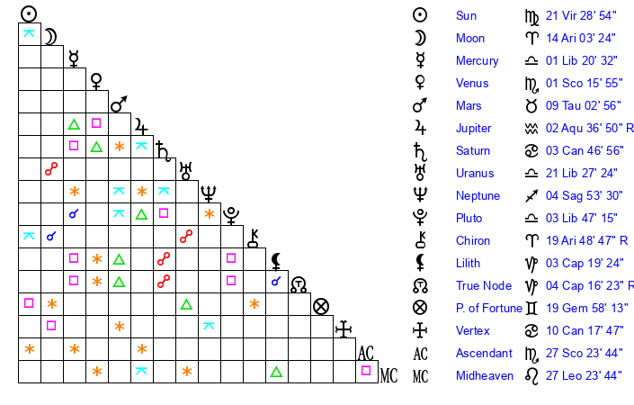 | Sun | 21 Virgo 18 | 21 Virgo 42 | 12 Scorpio 42 |