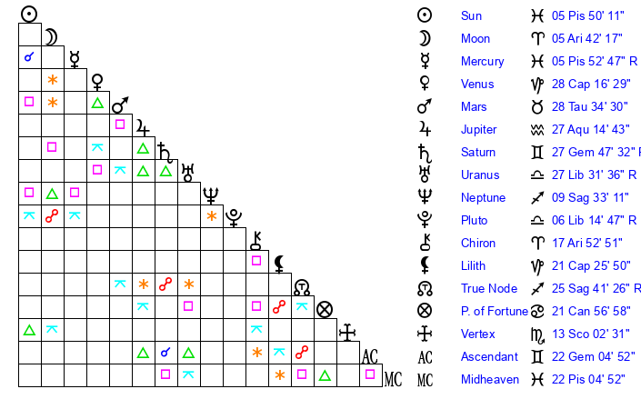 | Sun | 5 Pisces 16 | 5 Pisces 54 | 25 Aries 53 |