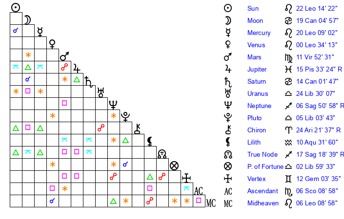 | Mercury | 19 Leo 46 | 5 Leo 10 | 6 Scorpio 56 |